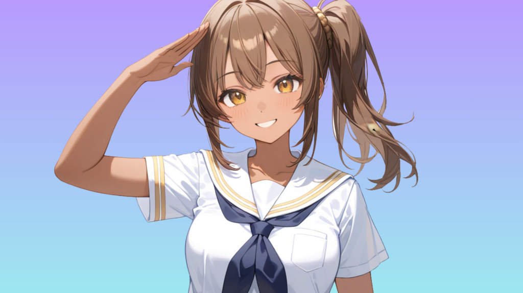 顔の横で手をピッと上げる敬礼ポーズ。